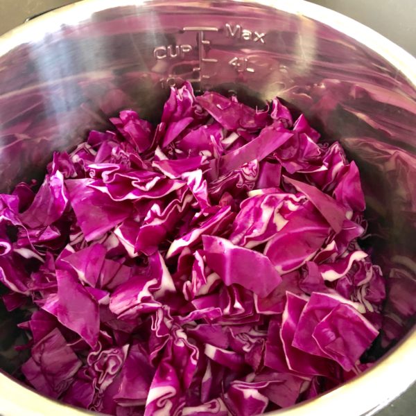 Spoel de rode kool af onder water en verwijder de uiterste bladeren. Snij in repen en voeg toe aan je Instant Pot.